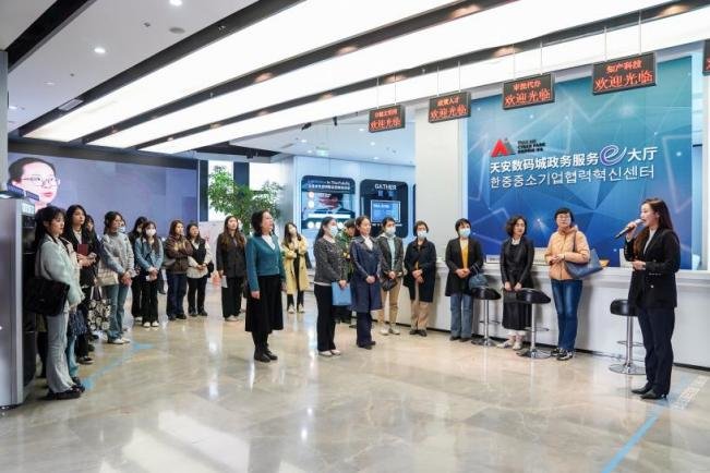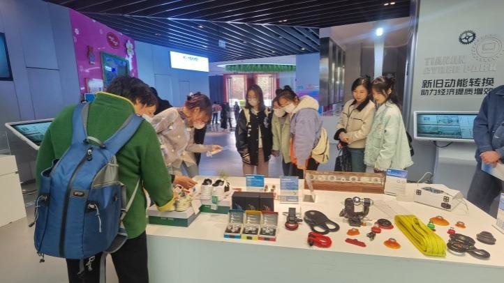 在青岛市“雏凤”赋能社会课堂——天安数码城,与会人员参观双创基地,了解园区运营及其中女企业家创业情况,观摩园区企业推出的巾帼好品。