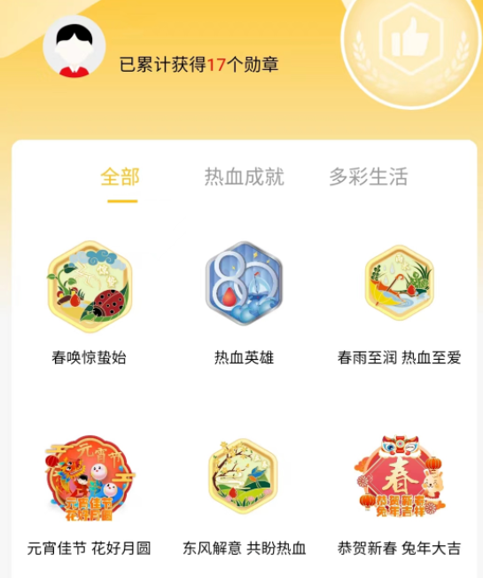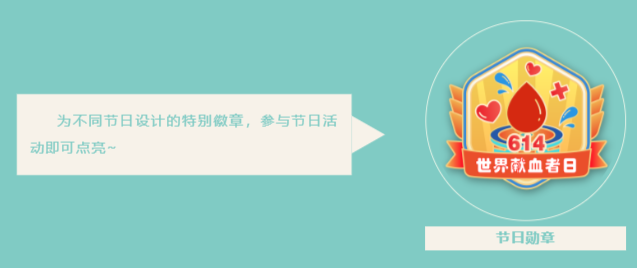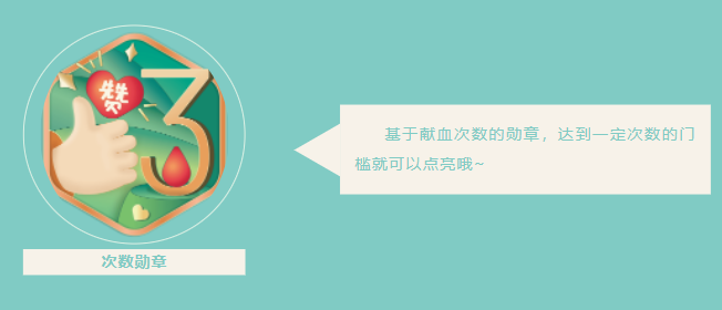 类型丰富,玩法多样。全新上线的无偿献血电子勋章系统,徽章类型将分为四大类——次数勋章、节日勋章、节气勋章和血型勋章。不同类型的勋章触发机制各异,玩法丰富,是为青岛市的广大无偿献血者专属定制的荣誉系统。