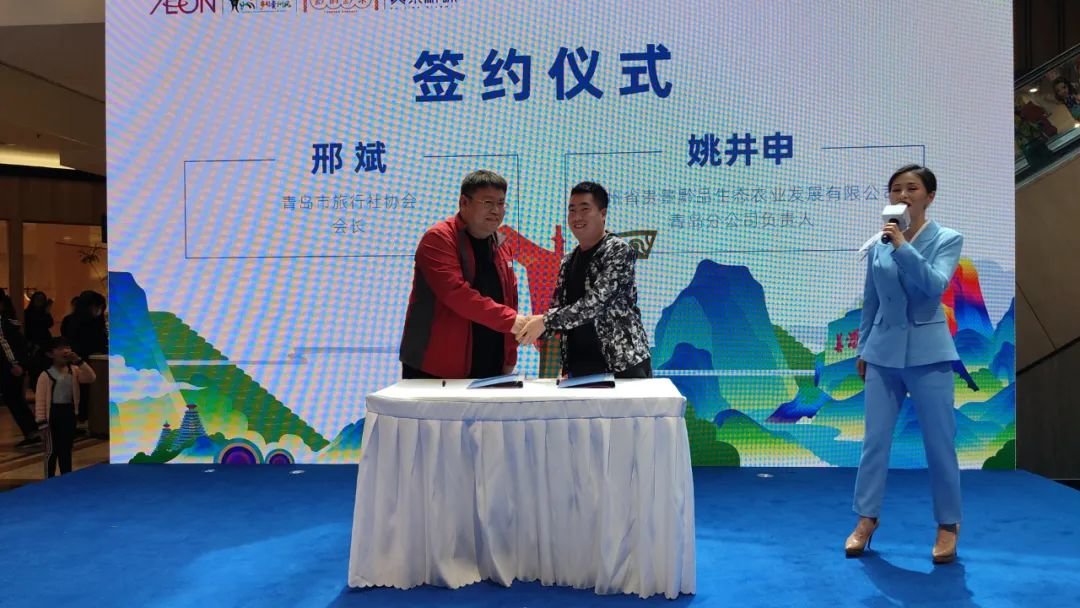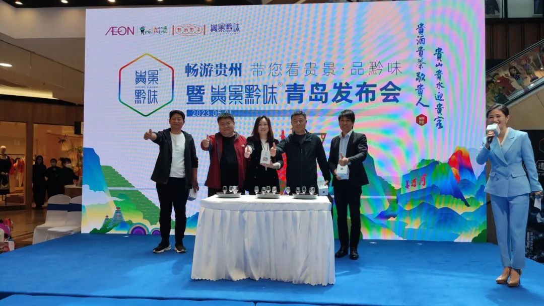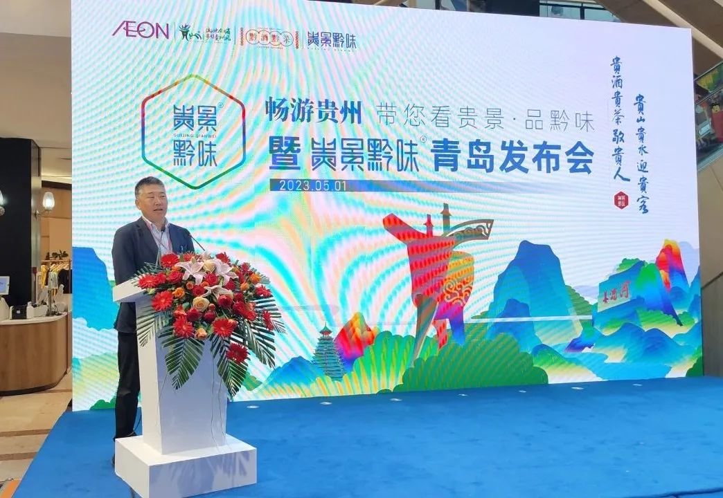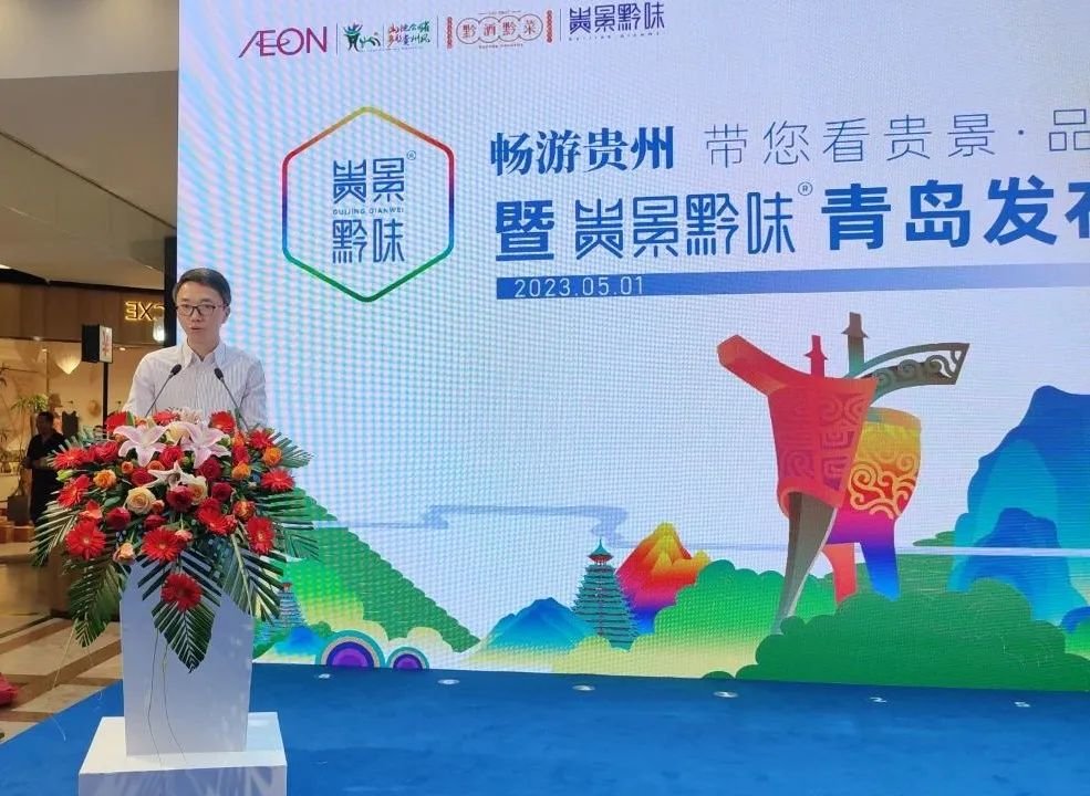为推动贵州农业产业升级,借助贵景黔味品牌力量,拓宽贵州农产品销售领域,畅销贵州农产品产销渠道,推进“黔货出山”,助力乡村振兴,2023年5月1日,由青岛永旺与贵景黔味共同举办的畅游贵州,带您看贵景·品黔味——贵景黔味品牌发布 会在青岛永旺东部店举行。青岛永旺东泰商业有限公司董事总经理谷直知,贵州省逍迅经贸有 限公司、 贵州省康乾盛贸易有限责任公司党委委员副总经理田彤, 青岛永旺东泰商业有限公司副总经理曲岩冰 , 贵州省物资开发投资公司副总经理冯刚, 贵州贵景黔味文旅产业有限公司副总经理周曙光 等领导和嘉宾出席活动。