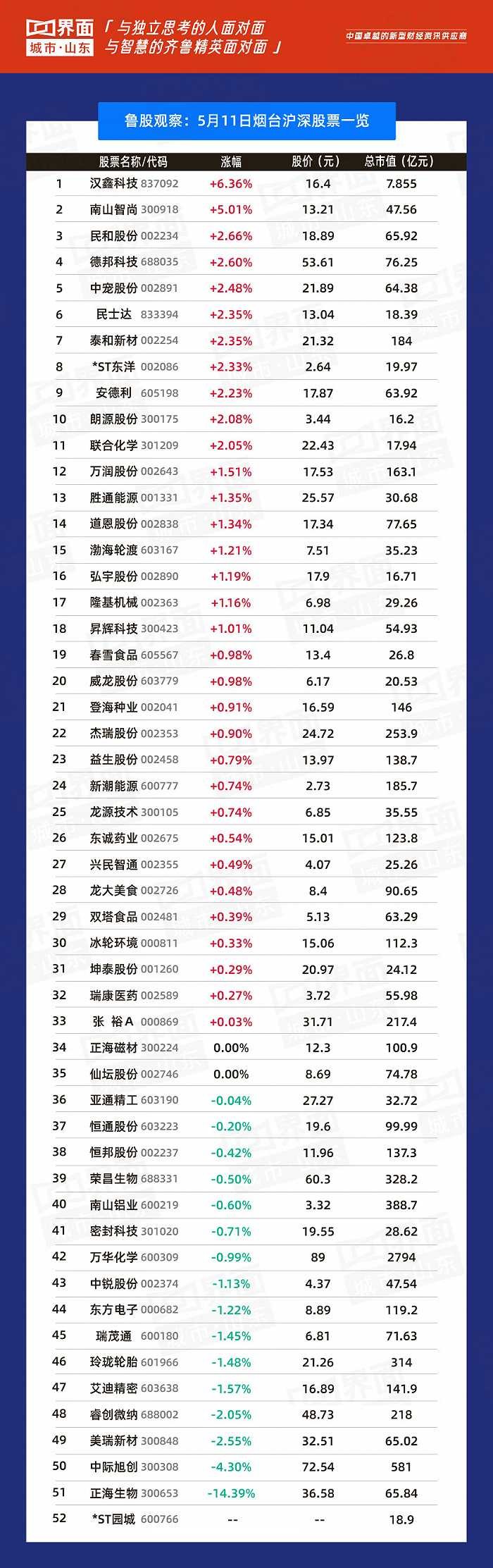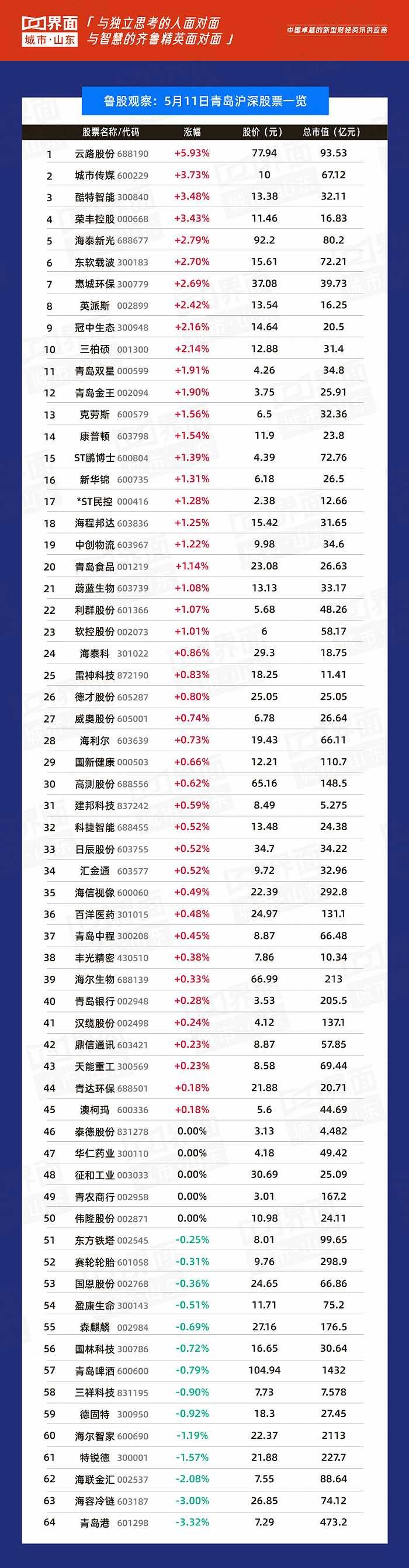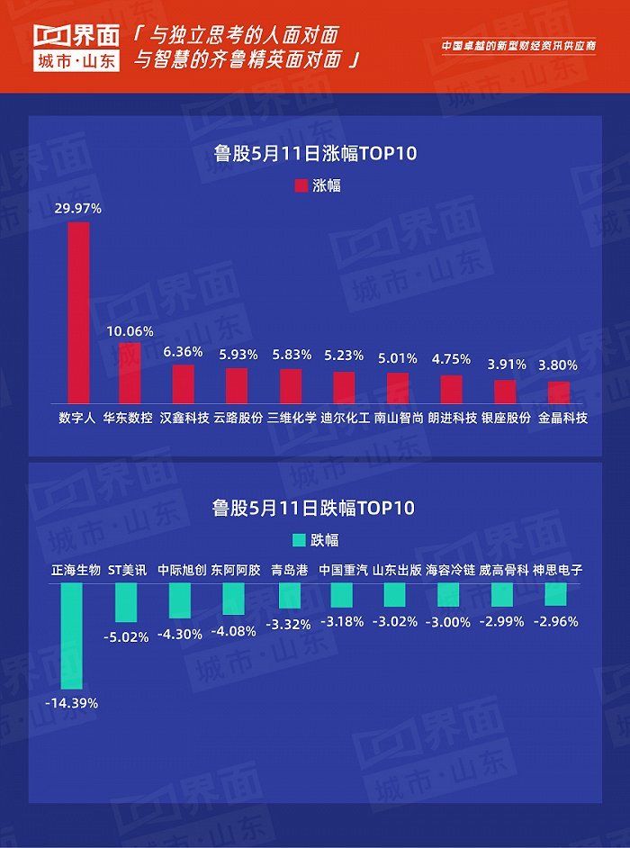 5月11日,山东188股上涨,89股下跌。