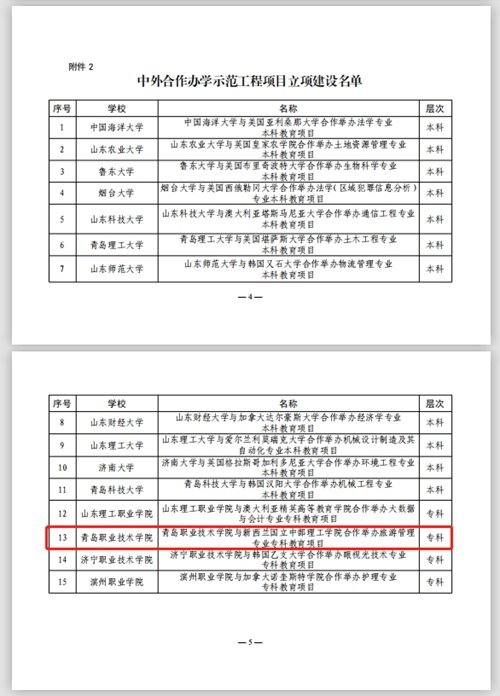 近日,山东省教育厅公布了高校中外合作办学示范工程立项建设名单,青岛职业技术学院与新西兰国立中部理工学院合作举办旅游管理专业专科教育项目成功入选。此次遴选确定了5个中外合作办学机构和15个中外合作办学项目,青岛职业技术学院为全省4所获得立项的高职院校之一。