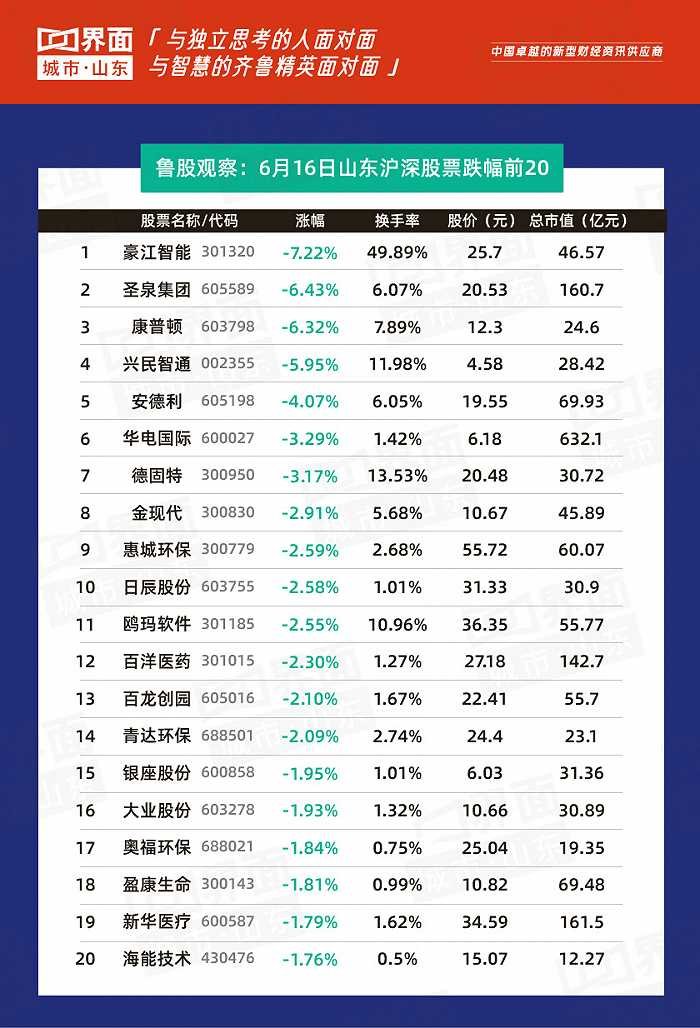 6月16日,山东158只个股上涨,128只个股下跌。