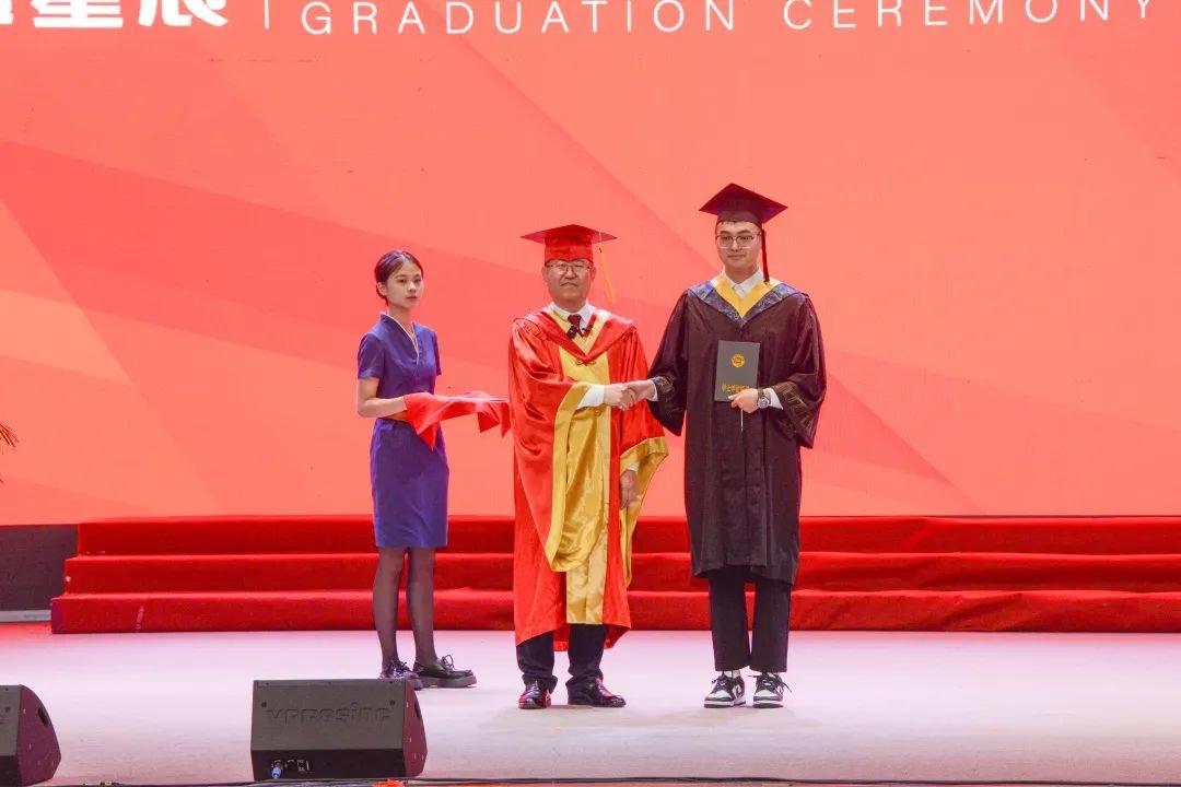 副校长梁玉冰宣读了《烟台南山学院关于表彰2023届优秀毕业生的决定》和《烟台南山学院关于表彰优秀考研学生的决定》;学校常务副校长刘传庚、教育集团党委书记王玉海分别为优秀毕业生代表、考研优秀学生代表颁发证书,并向他们致以祝贺。
