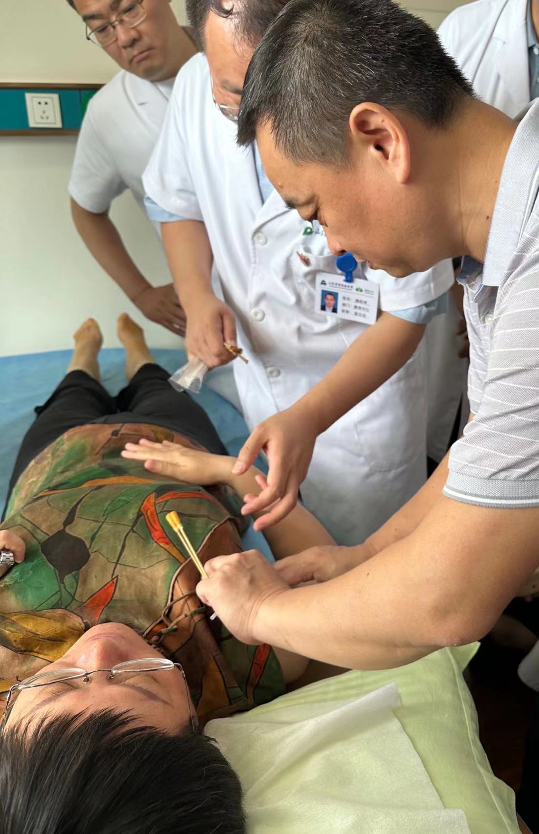 揭牌仪式结束后,陈教授现场实操为患者进行诊疗,分析患者病症原因,并用小小银针解除患者病痛。