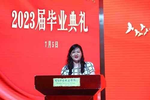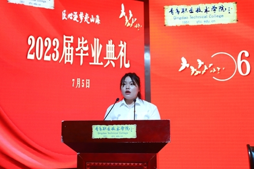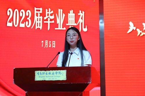 生物与化工学院毕业生李娜作为五年制贯通培养优秀毕业生代表发言。她回顾了在青岛职业技术学院和青岛市化工中等专业学校学习的五年时光,感谢母校在促进专业成长、提升学习水平、融入校园生活、规划职业生涯等方面的悉心教导和培养。每名毕业生都在各自的赛道上用优异的成绩,为母校实施的以“三化”促“三高”发展战略贡献着力量。她表示大家将满载母校的期望与嘱托,砥砺前行,以青春之名,赴时代之约。