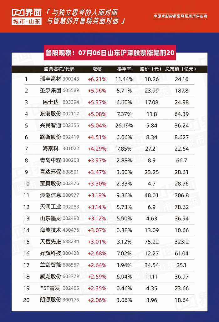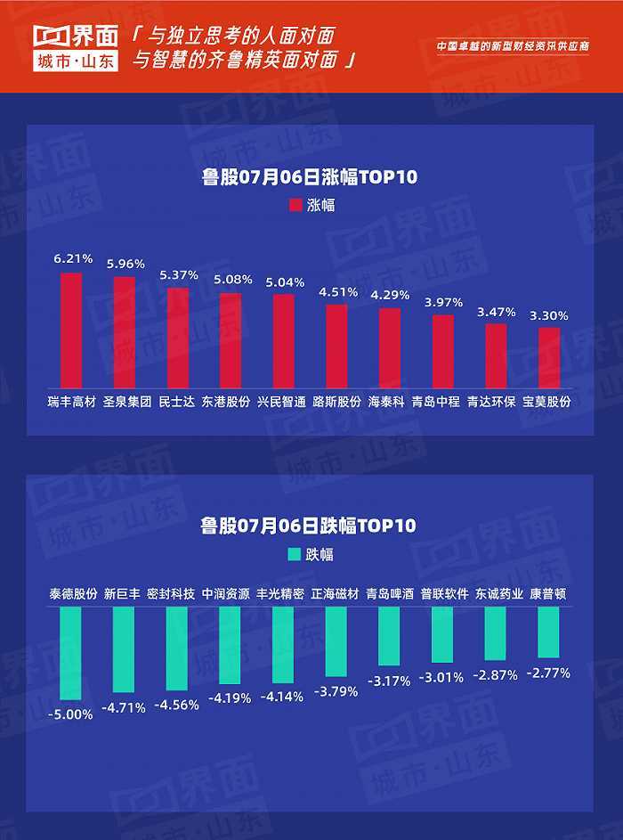 7月6日,山东省内沪深京股票有98只个股上涨,189只个股下跌。
