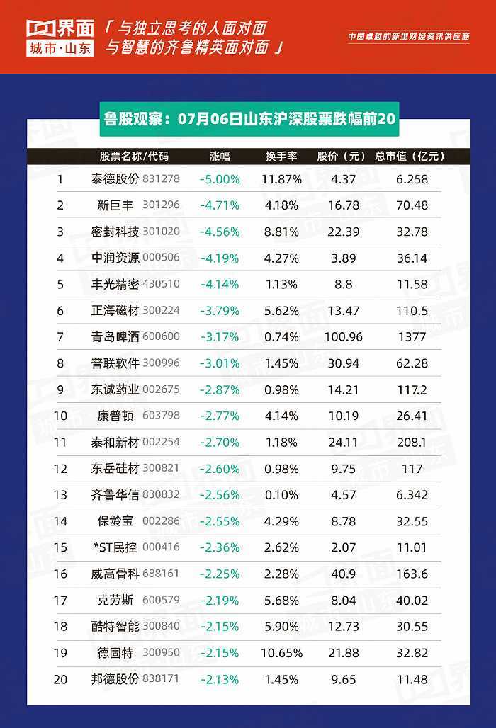 原标题:鲁股观察|7月6日:A股三大指数今日集体收跌,山东187只个股下跌