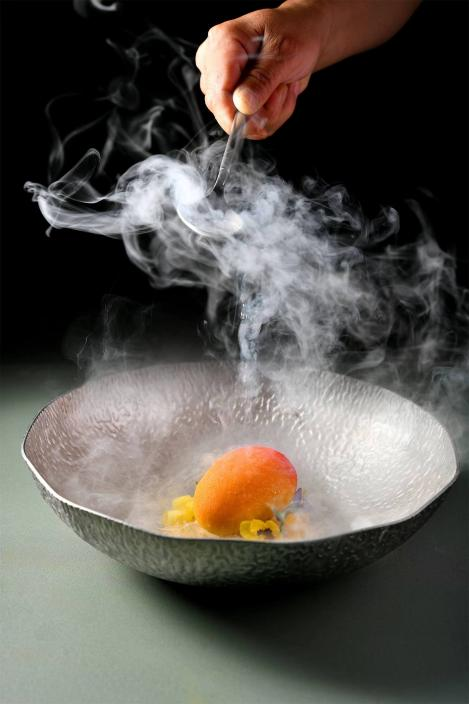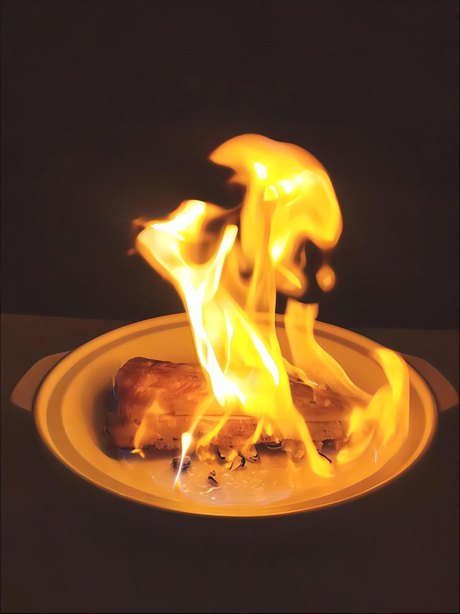 其中,制作、品尝焰火恋蝶鱼的过程极具体验感、仪式感。厨师对深海鲽鱼进行腌制8个小时之后,再置于果木之上烤制,小火与大火交替,大火烤以熟,小火攻于味,最后以干葱头、姜、蒜子煸香置于砂锅底部,采用粤菜生焗的方法加以煸香,让深海鲽鱼的味型更丰富有层次。