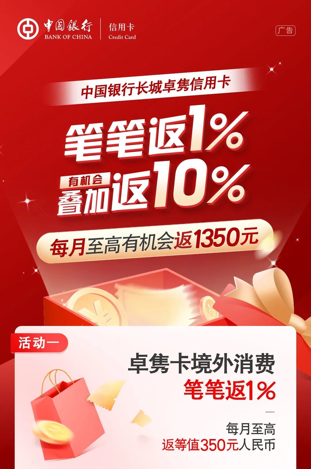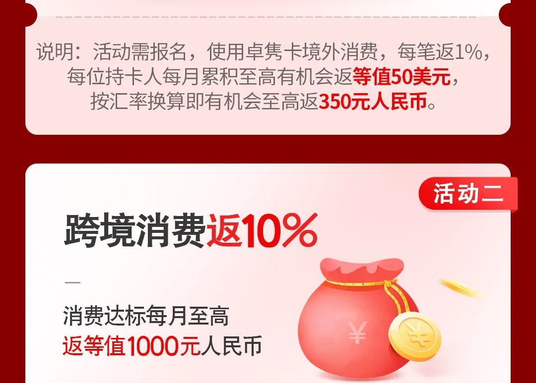 卓隽卡境外消费每月至高有机会返1350元!