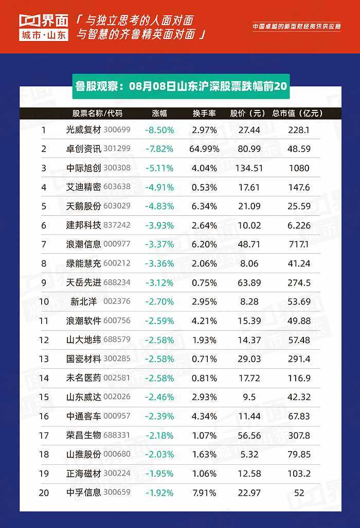 烟台市跌幅榜首:中际旭创(300308),跌幅5.11%,股价134.51元,总市值1080亿元。