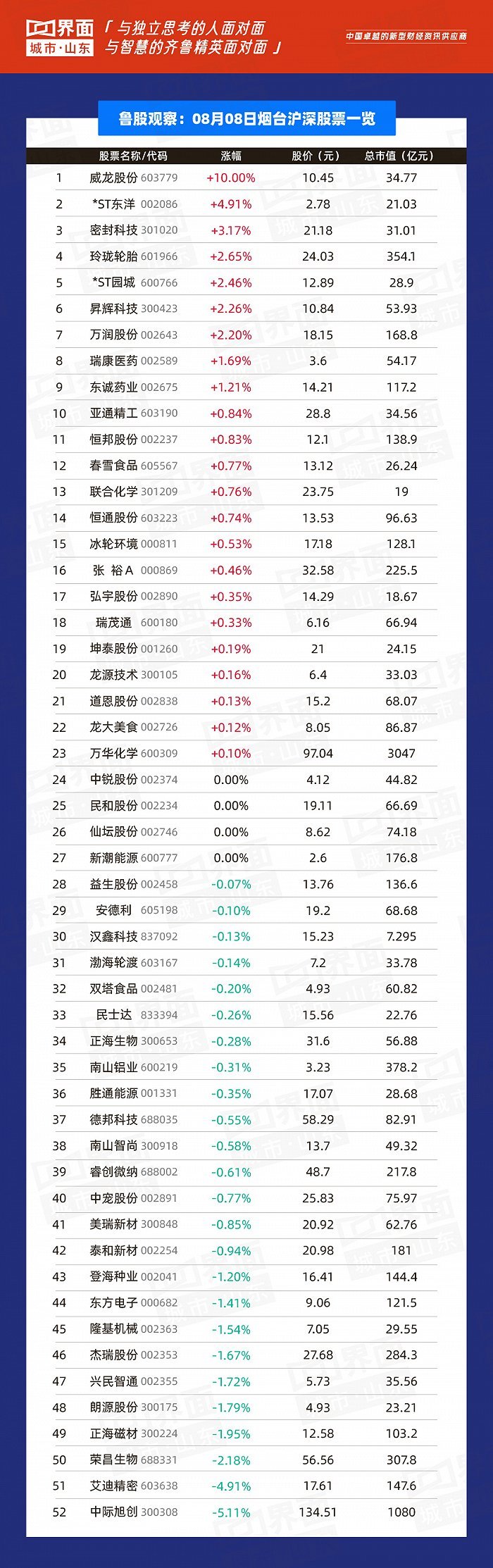 烟台市涨幅榜首:威龙股份(603779),涨幅10%,股价10.45元,总市值34.77亿元;