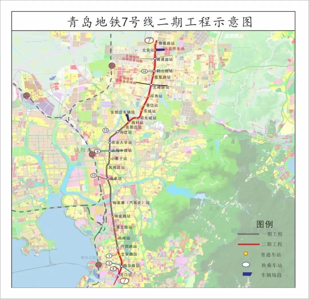 同在市区北岸的7号线二期是即墨的骨干线路,服务内部交通出行,实现与主中心的快速联系,由北段和南段组成。其中北段长12.8公里,设站11座,南段长3.7公里,设站3座,主要服务即墨中心区、李沧西部区域,实现即墨与城阳、东岸主城区的快速联系。