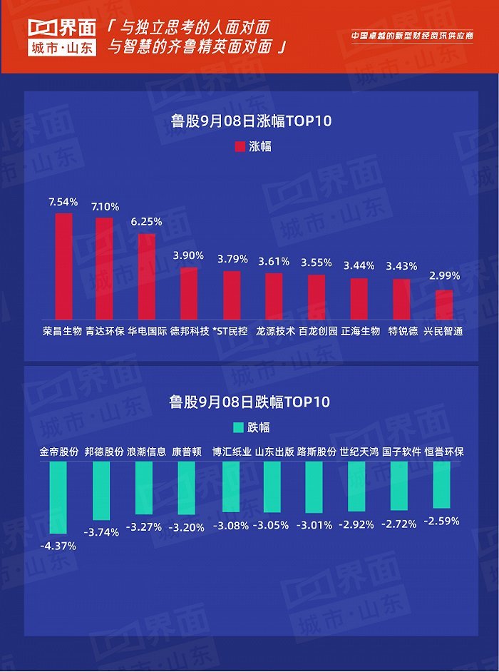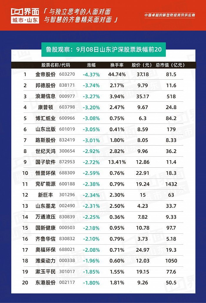 9月8日,山东省内沪深股票有148只个股上涨,141只个股下跌;总市值过千亿的有万华化学(600309)、海尔智家(600690)、兖州煤业(600188)、青岛啤酒(600600)、中航沈飞(600760)、山东黄金(600547)、潍柴动力(000338)共7家,500亿-1000亿的共有6家,分别是中际旭创(300308)、华鲁恒升(600426)、歌尔股份(002241)、浪潮信息(000977)、华电国际(600027)、中泰证券(600918)。