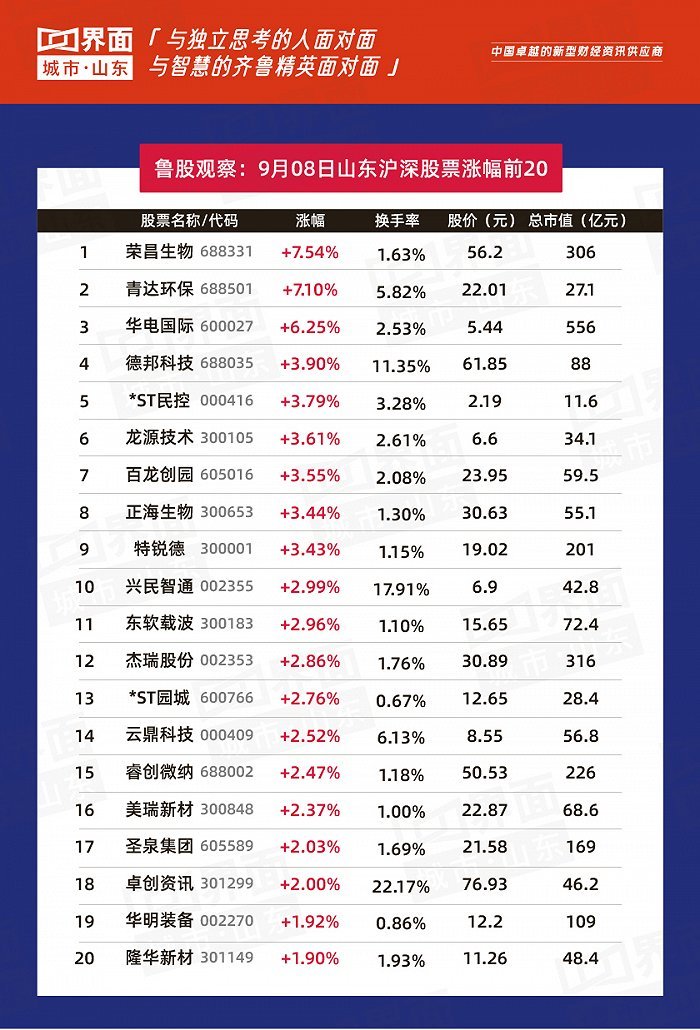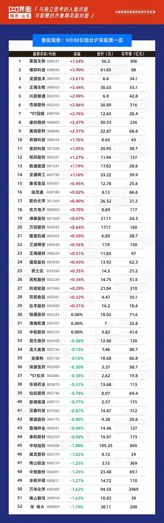 烟台市涨幅榜首:荣昌生物(688331),涨幅7.54%,股价56.2元,总市值306亿元;