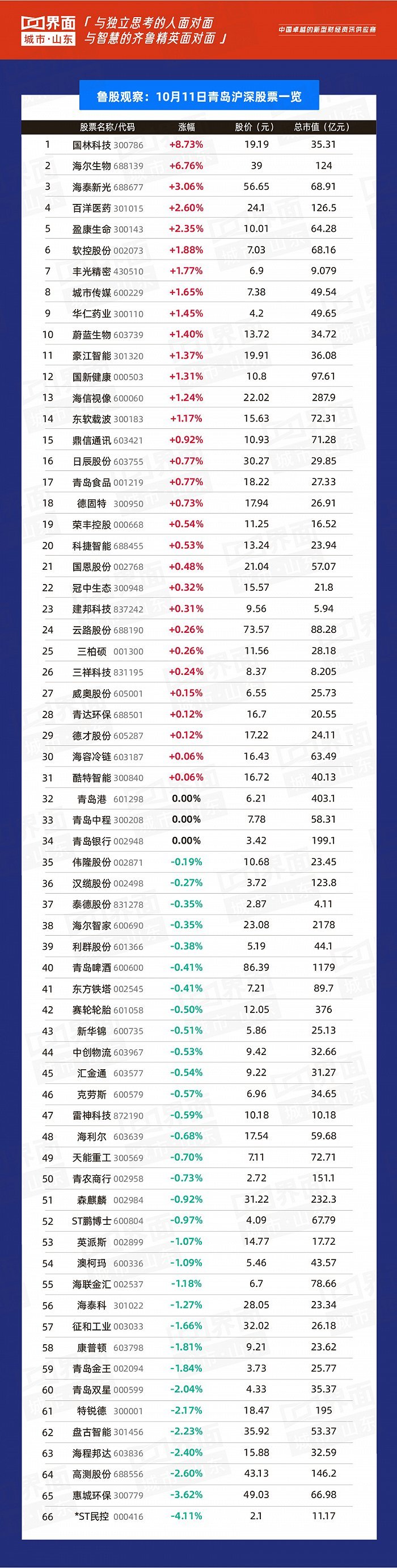 青岛市涨幅榜首:国林科技(300786),涨幅8.73%,股价19.19元,总市值35.31亿元;