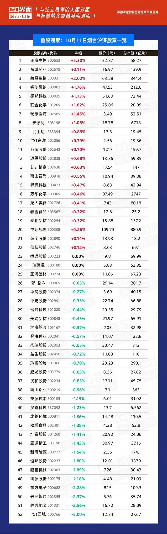 烟台市涨幅榜首:正海生物(300653),涨幅5.30%,股价32.27元,总市值58.27亿元;