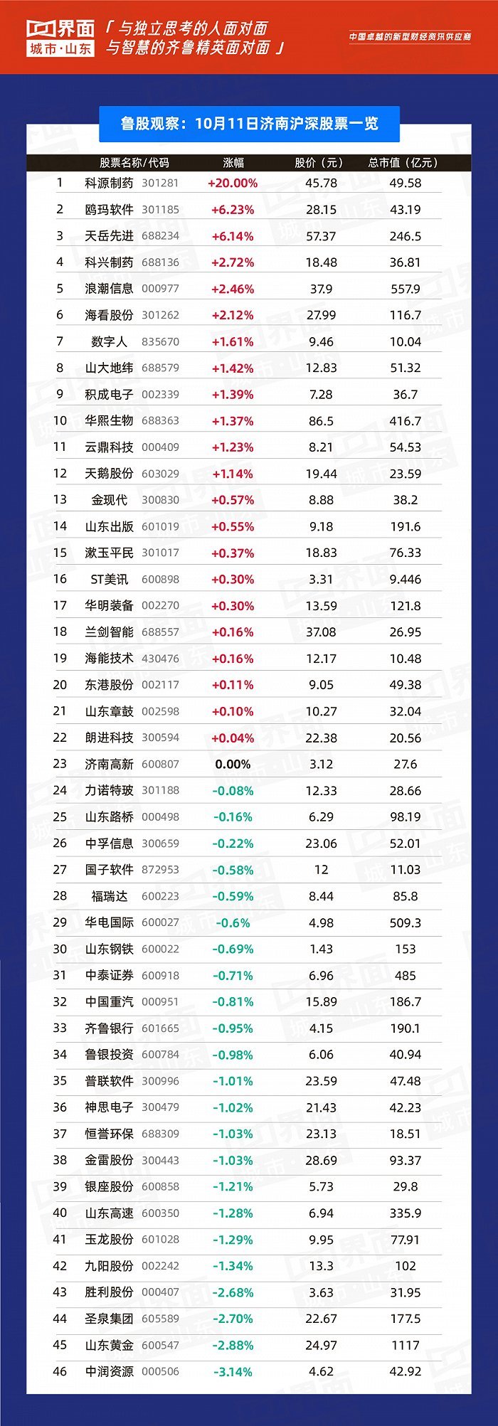 济南市涨幅榜首:科源制药(301281),涨幅20.00%,股价45.78元,总市值49.58亿元;