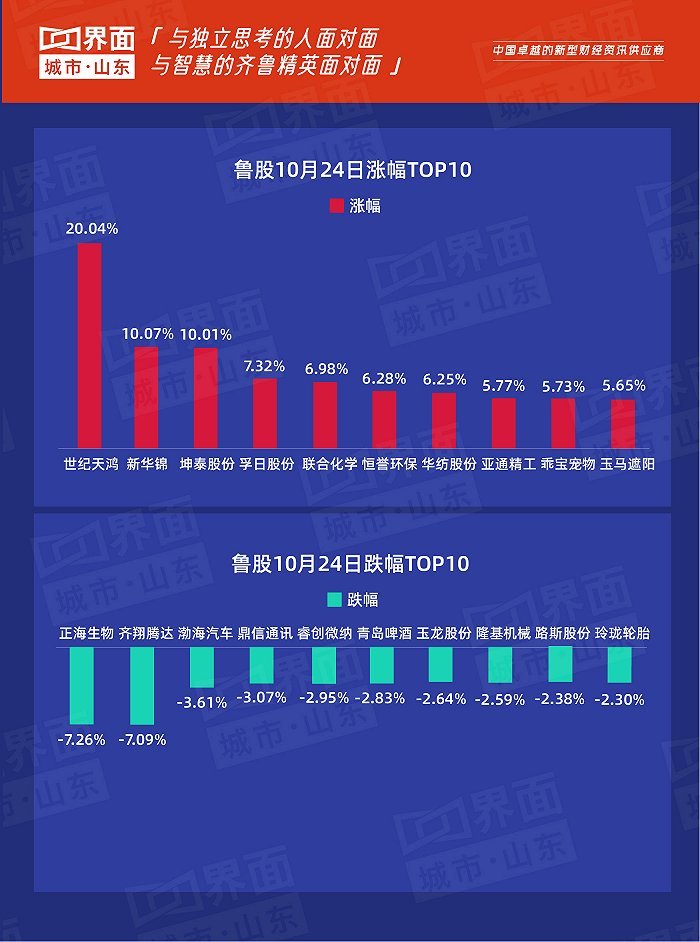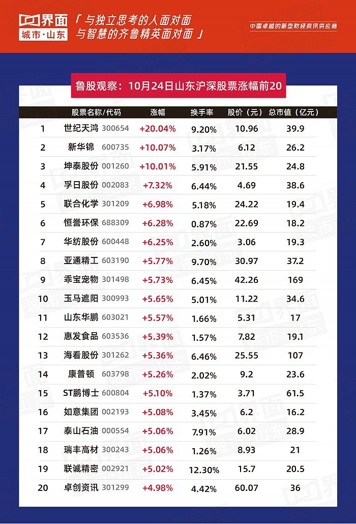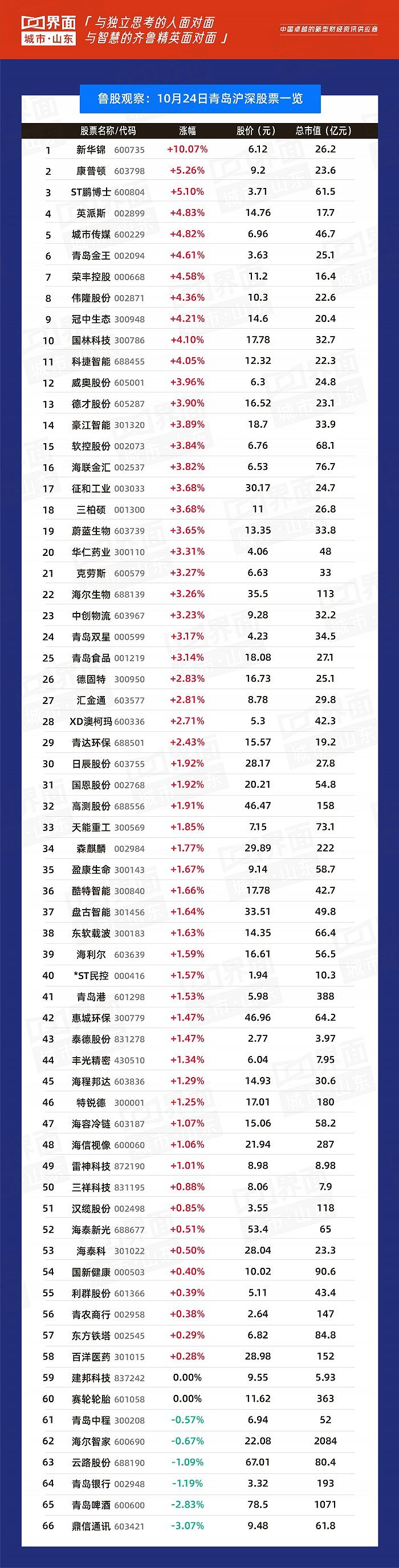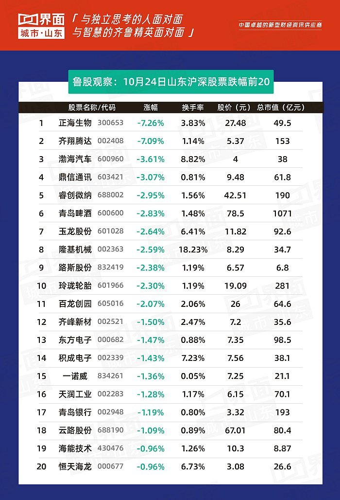 10月24日,山东省内沪深股票有271只个股上涨,31只个股下跌;总市值过千亿的有万华化学(600309)、海尔智家(600690)、兖州煤业(600188)、青岛啤酒(600600)、中航沈飞(600760)、山东黄金(600547)、潍柴动力(000338)共7家,500亿-1000亿的共有3家,分别是中际旭创(300308)、华鲁恒升(600426)、歌尔股份(002241)。