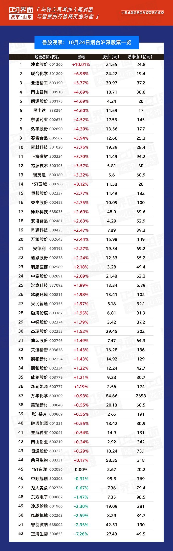 烟台市涨幅榜首:坤泰股份(001260),涨幅10.01%,股价21.55元,总市值24.8亿元;