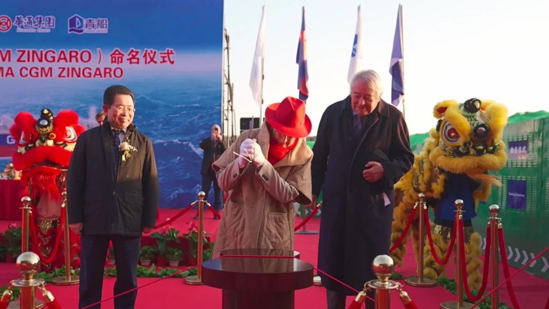 Nadine Saverys女士作为教母将新船命名为“CMA CGM ZINGARO”轮。她在CMB集团董事局主席Marc Saverys、华通集团总经理张伟陪同下,共同开启“掷瓶礼”,为新船送上美好祝福。
