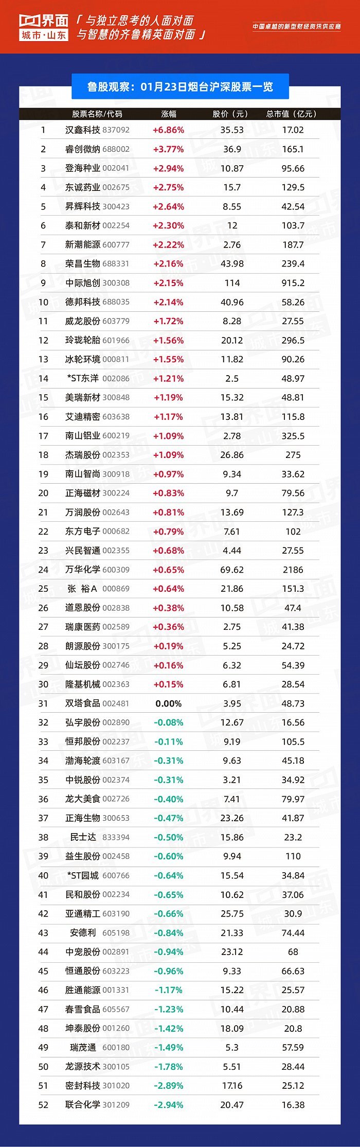 1月23日,山东150只个股上涨,152只个股下跌。