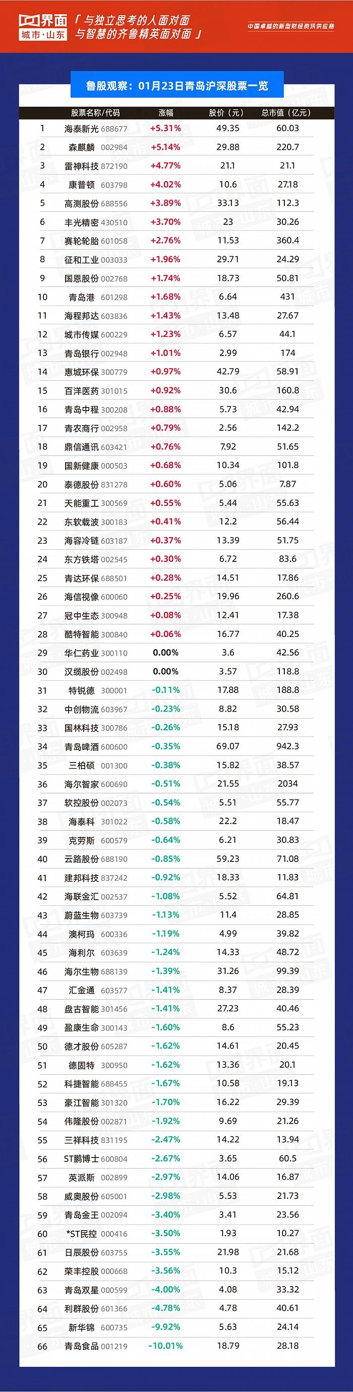 青岛市涨幅榜首: 海泰新光(688677),涨幅5.31%,股价49.35元,总市值60.03亿元;