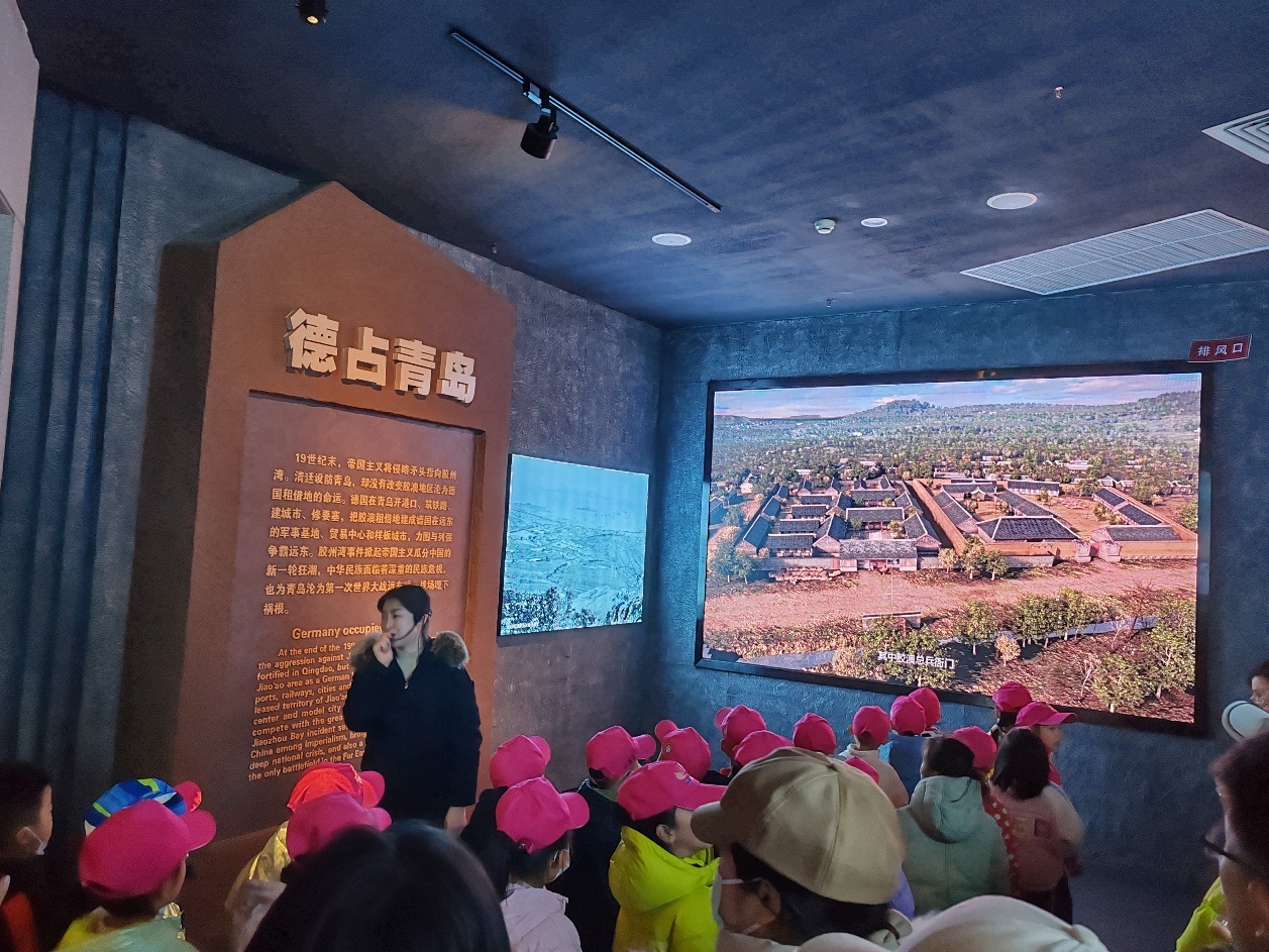 青岛山炮台遗址展览馆位于青岛山脚下一战遗址公园内,展览以“还我青岛”为主题,分为“德占青岛”“日德战争”“苦难归程”三个部分。运用大量珍贵文物、档案资料以及场景复原、多媒体等现代化布展方式,再现了自青岛建置至主权回归的艰难历程。展览馆内,讲解员用深情的语言,为孩子们讲述了青岛当年被德国和日本侵占的屈辱历史。孩子们听着那些令人心痛的历程,脸上露出了沉重的表情。他们仿佛能够感受到那段黑暗岁月中,家乡人民所经历的苦难与挣扎。