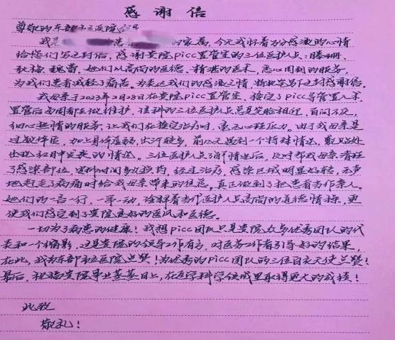 面对上肢唯一可穿刺的纤细腋静脉,在准确超声定位下,滕珊凭借精湛的穿刺技术,稳、准进针,一针见血;凭借丰富的经验她运用皮下隧道技术,成功将导管出口置于最佳位置;同时在微创介入治疗中心的帮助下,解决了血管走形异常导致的置入导管的异位问题。在多学科团队联手努力下,团队 “逢山开路,遇水架桥”,顺利完成PICC置管,为患者成功开辟生命通道。