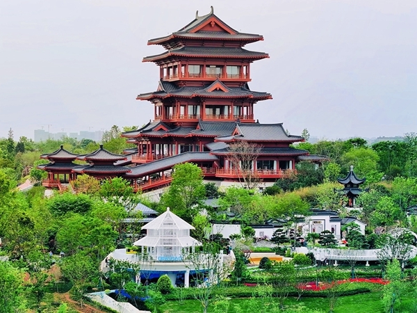 “锦云楼”是成都世园会主会场核心场馆,青岛园场地面积约1500㎡,与这座核心建筑楼比邻而居。