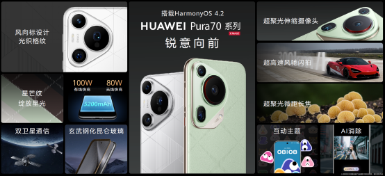 HUAWEI Pura 70系列手机搭载HarmonyOS 4.2,带来全新的互动主题、AI消除、AI云增强功能,更有趣、更智能。此外,华为方舟引擎让操作更流畅。HarmonyOS 4.2也让应用安全得到充分保障,体验更安全。