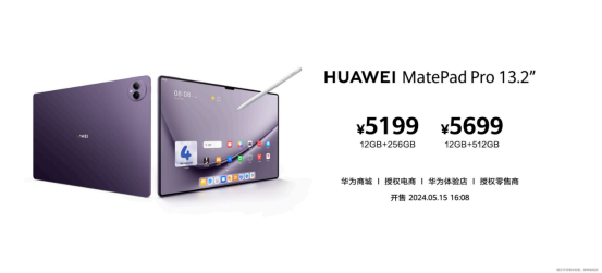 华为MatePad Pro 13.2英寸罗兰紫,12GB+256GB版本售价5199元、12GB+512GB版本售价5699元,支持HUAWEI Care+服务(两年期899元、一年期399元)购买,5月15日16:08正式开售,同时该平板还有雅川青、曜金黑、晶钻白三款配色,欢迎前往选购。