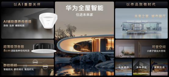 华为全屋智能围绕智美体验升级,推出华为全屋智能AI康养解决方案、超薄吸顶音箱、群控调光驱动器等全新产品,并以华为全屋智能未来之家、可变空间等空间作品,再度刷新空间智能化体验。
