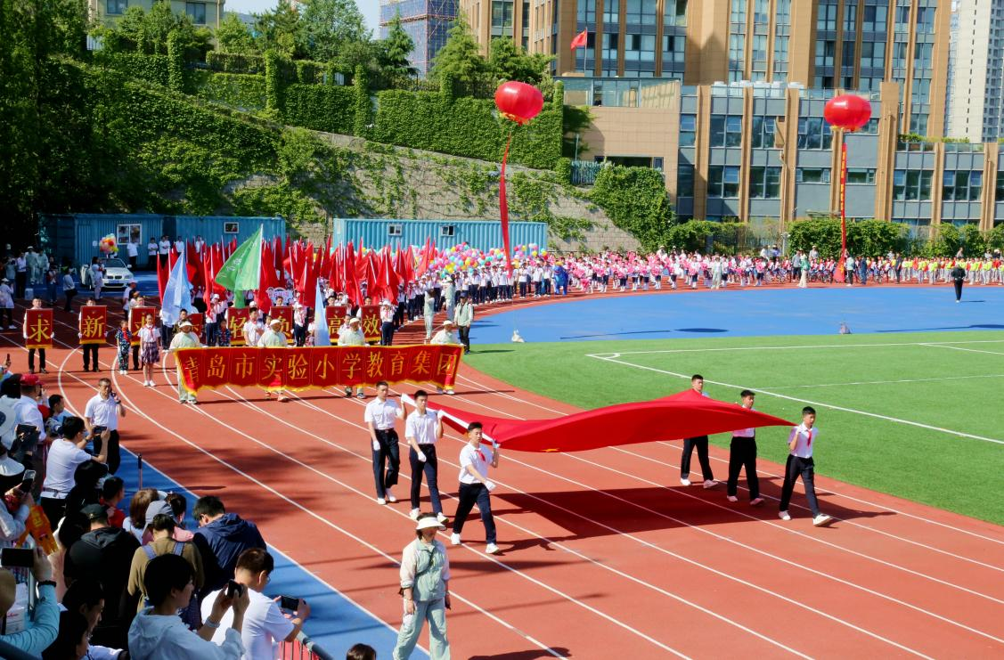 方队列阵前行,当映衬着孩子笑脸的“青岛市实验小学教育集团”集团校牌出现在主席台前时,欢呼声一浪高过一浪,现场师生们显得格外兴奋。走在集团校牌后面的是青岛市实验小学、青岛八大峡小学、青岛宁德路小学各校的校旗方队,旗手们高举校旗成最稳固的三角形向前行进,展示了三所学校呈“中部示范引领、东西两翼齐飞”的教育发展新格局。