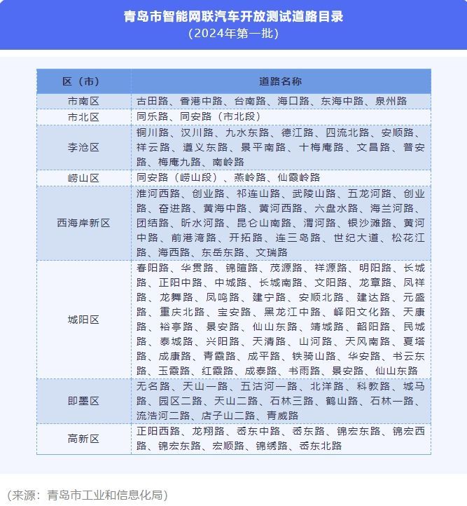 7月4日,记者从青岛市工业和信息化局网站公布的《关于公布青岛市智能网联汽车开放测试道路目录(2024年第一批)的通知》获悉,经道路测试主体申报、市智能网联汽车道路测试与示范应用联席工作小组研究决定,公布开放测试道路目录。涉及市南区、市北区等八个区(市),共121条道路。其中部分道路仅开放特定路段,具体范围以市智能网联汽车道路测试与示范应用联席工作小组批复为准。