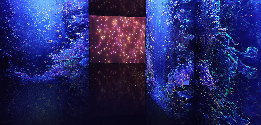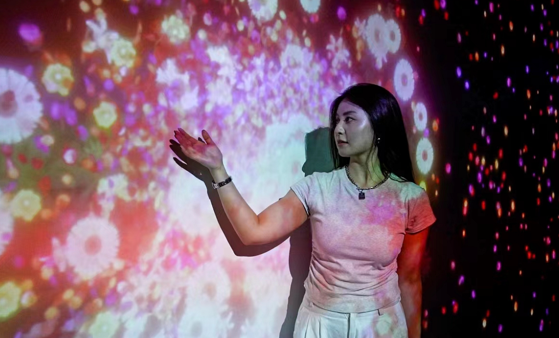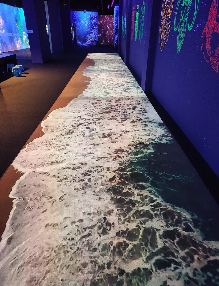 《花之海》:这是一个适合发呆的沉浸式空间。数字艺术家与音乐家一起打造了一个梦幻的沉浸空间。当你触摸墙面上飘浮的花瓣时,花儿便会复活重生;当你依靠在墙面时,身上也会开满花朵。