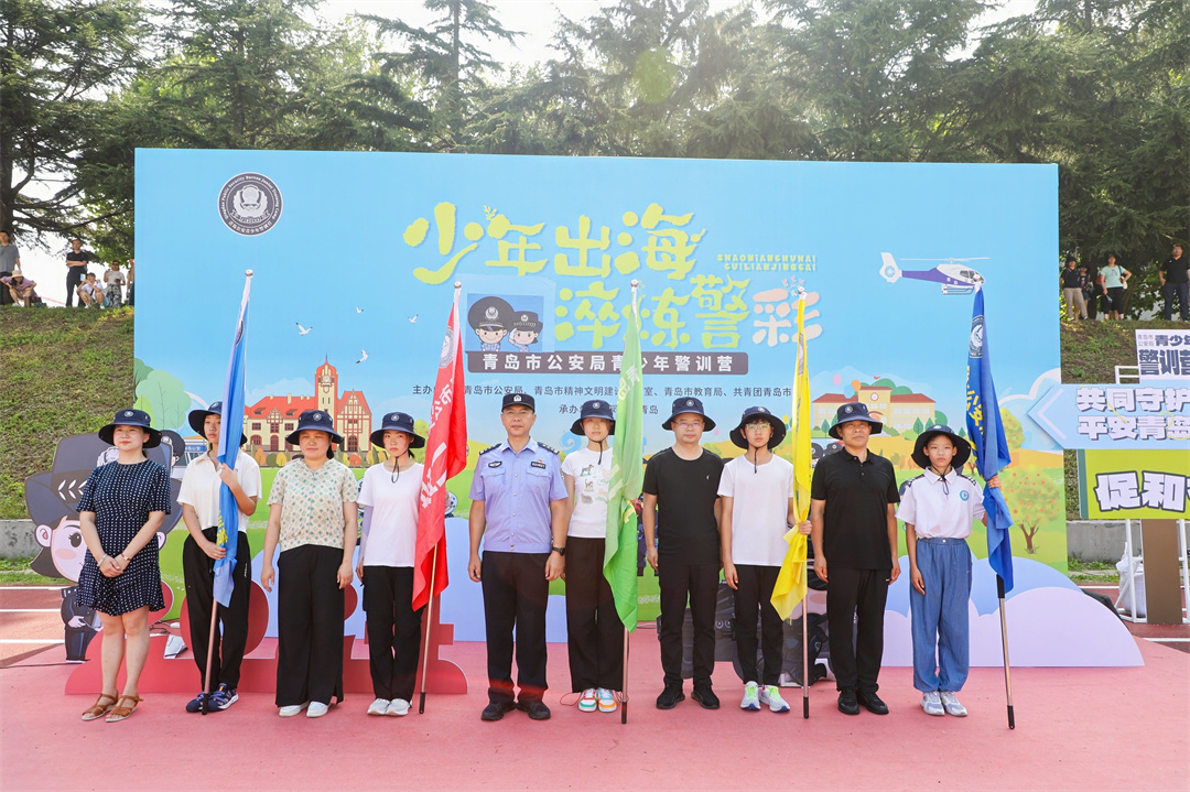作为启动仪式的重要环节,青岛市公安局、青岛市精神文明建设办公室、青岛市教育局、共青团青岛市委、凤凰网青岛的领导为学生代表授予少年警训营营旗。