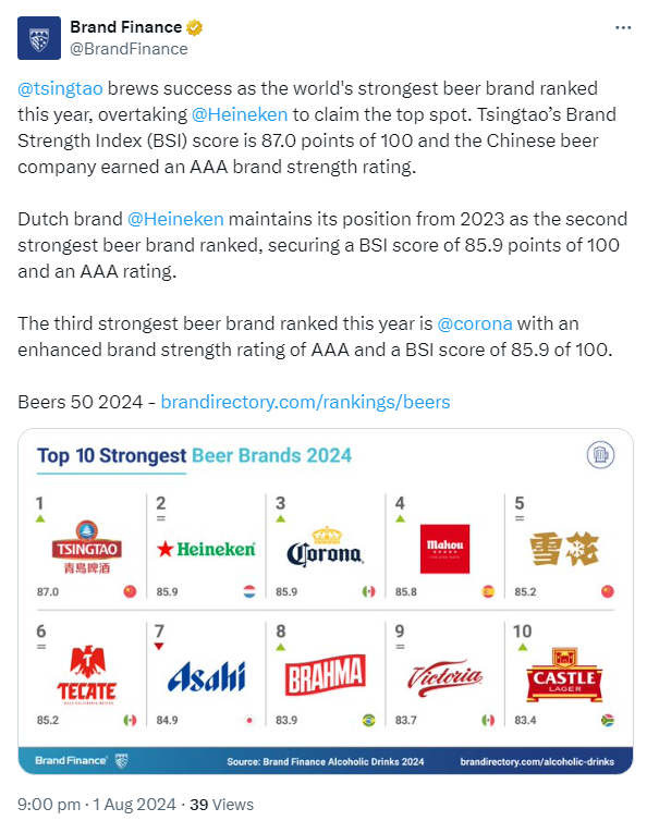 近日,总部位于英国的全球权威品牌评估咨询公司Brand Finance在官网发布2024年度全球啤酒品牌力top榜单和全球品牌价值top榜单,同时其twitter官方账号@青岛啤酒、科罗娜、和喜力三家公司官方账号,祝贺青岛啤酒超过喜力成为24年度品牌力冠军,科罗娜取代喜力成为品牌价值冠军。