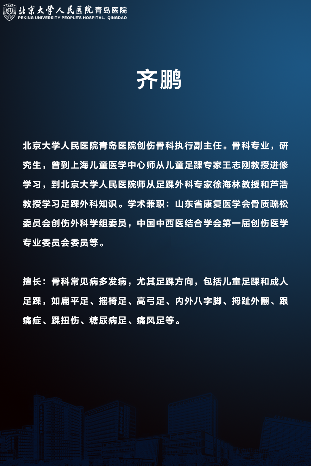 擅长:骨科常见病多发病,尤其足踝方向,包括儿童足踝和成人足踝,如扁平足、摇椅足、高弓足、内外八字脚、拇趾外翻、跟痛症、踝扭伤、糖尿病足、痛风足等