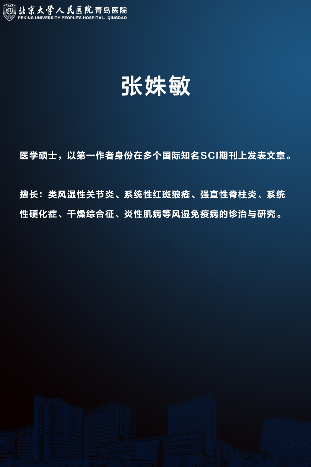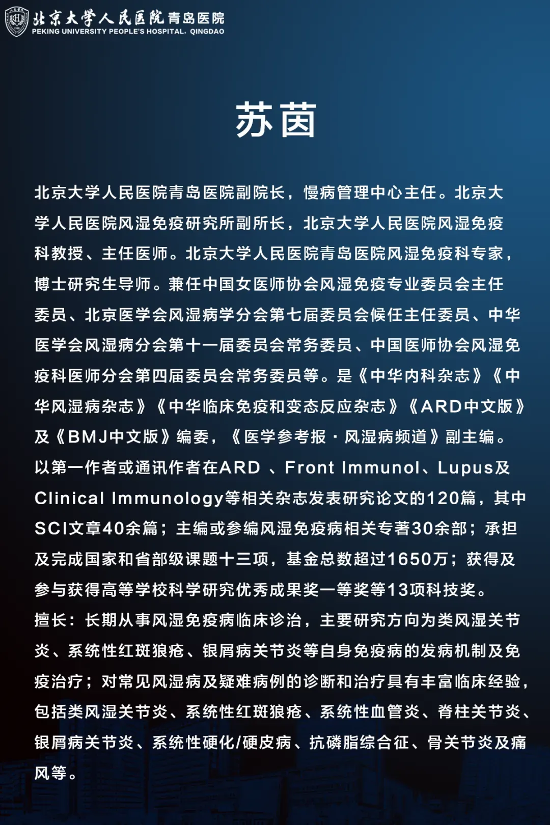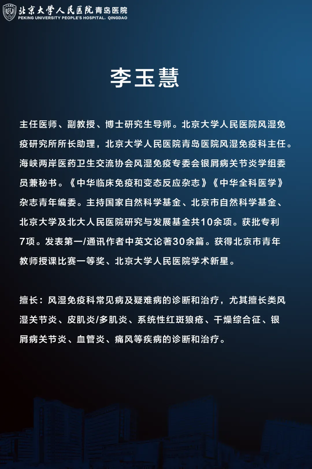 北京大学人民医院青岛医院副院长,慢病管理中心主任。主任医师,教授,博士生导师,北京大学人民医院风湿免疫研究所副所长。
