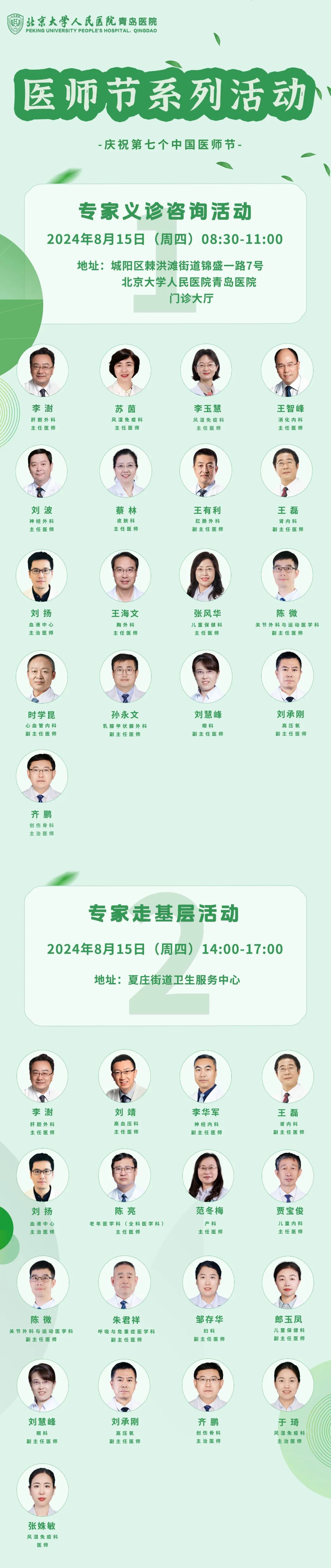 肝胆外科李澍、风湿免疫科苏茵、风湿免疫科李玉慧、消化内科王智峰、神经外科刘波、皮肤科蔡林、肛肠外科王有利、肾内科王磊、血液中心刘扬、胸外科王海文、儿保科张风华、关节外科与运动医学科陈微、心血管内科时学昆、乳甲外科孙永文、眼科刘慧峰、高压氧科刘承刚、创伤骨科齐鹏。