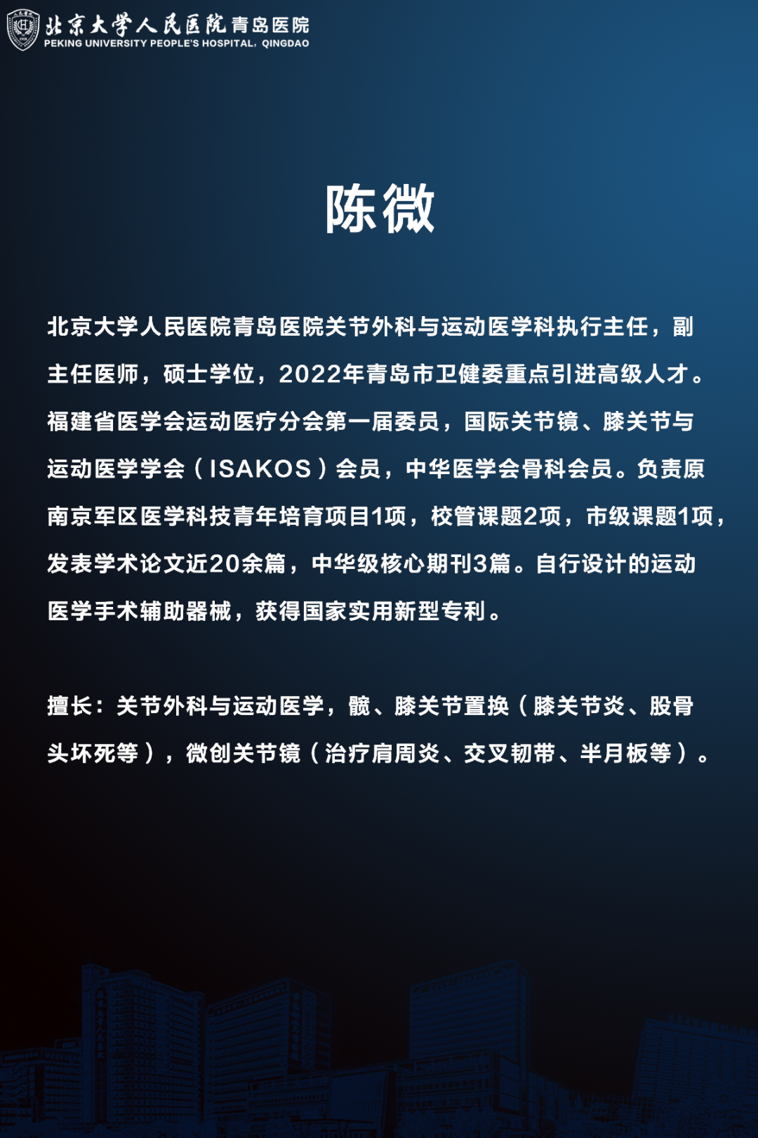 副主任医师,北京大学人民医院青岛医院关节外科与运动医学科执行主任。