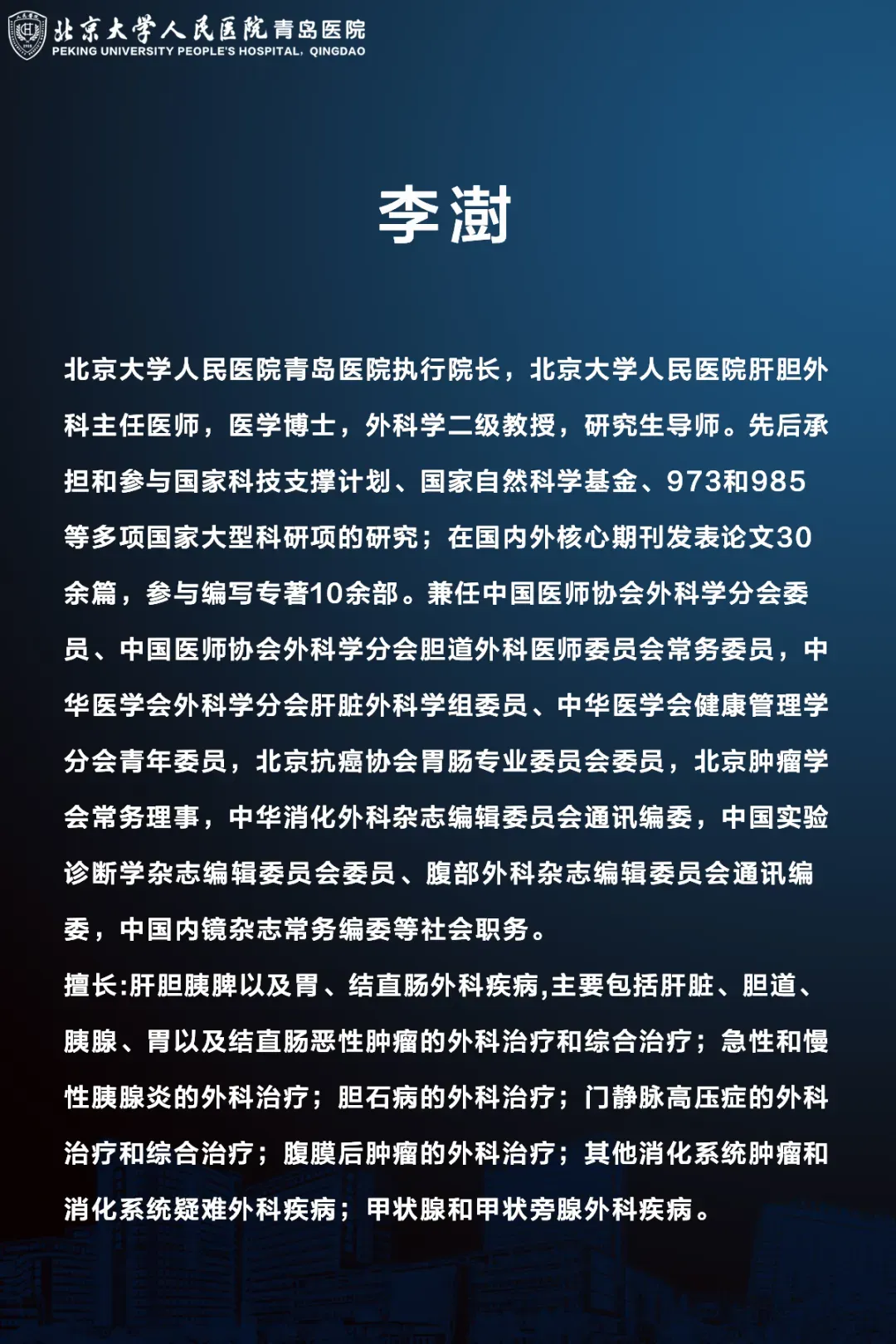 北京大学人民医院青岛医院执行院长,消化疾病中心主任。外科学教授,主任医师,医学博士,研究生导师。