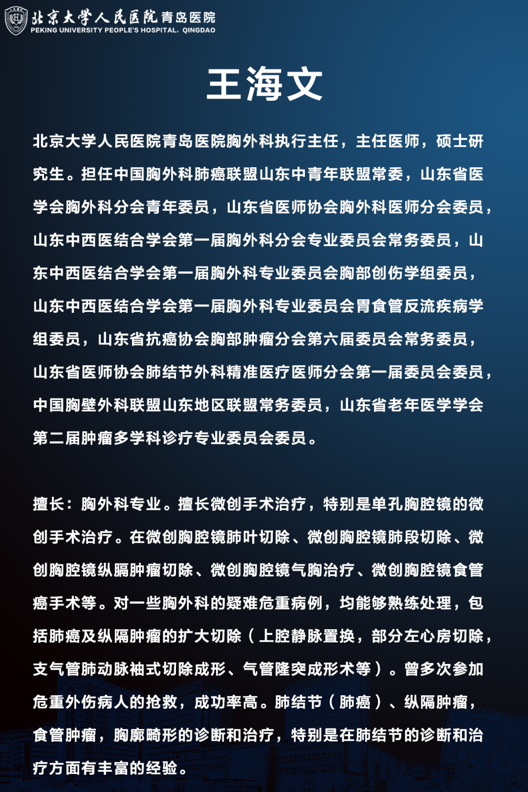 主任医师,北京大学人民医院青岛医院胸外科执行主任。