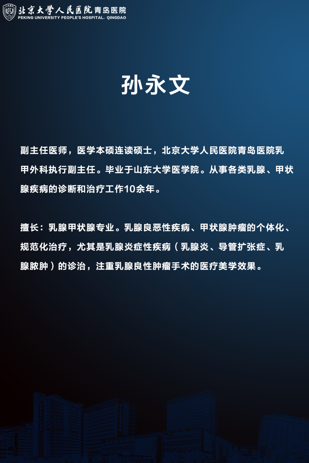 副主 任医 师,北京大学人民医院青岛医院乳甲外科执行副主任。