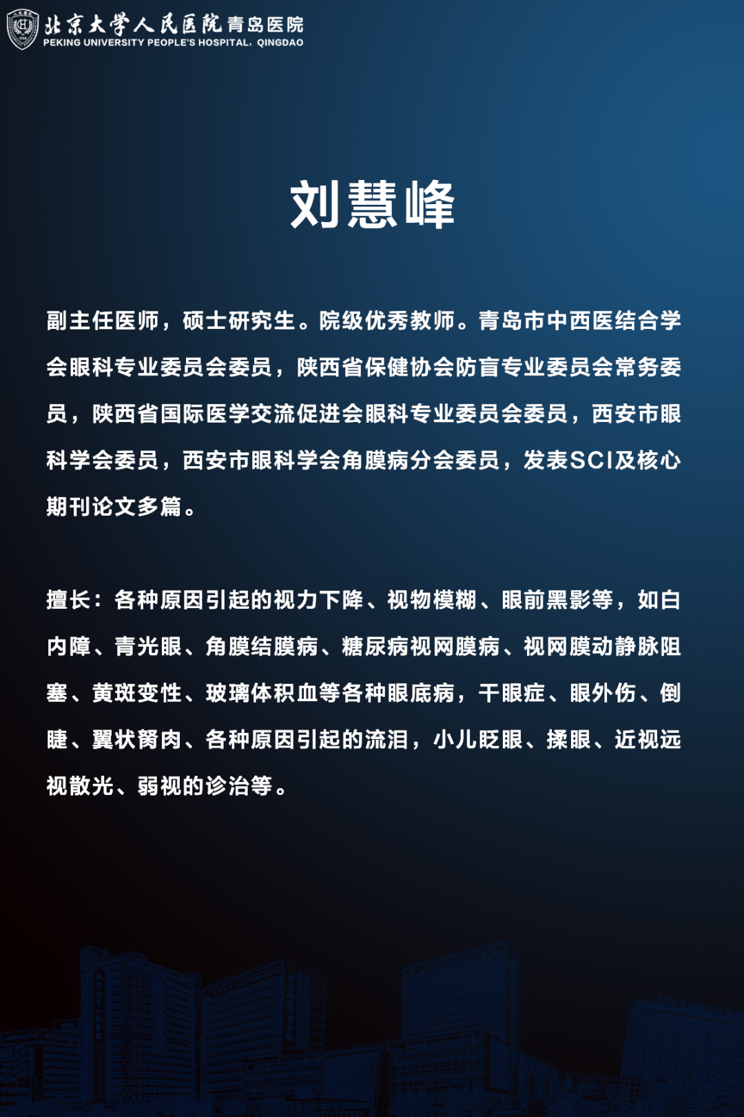 擅长:各种原因引起的视力下降、视物模糊、眼前黑影等,如白内障、青光眼、角膜结膜病、糖尿病视网膜病、视网膜动静脉阻塞、黄斑变性、玻璃体积血等各种眼底病,干眼症、眼外伤、倒睫、翼状胬肉、各种原因引起的流泪,小儿眨眼、揉眼、近视远视散光、弱视的诊治等。