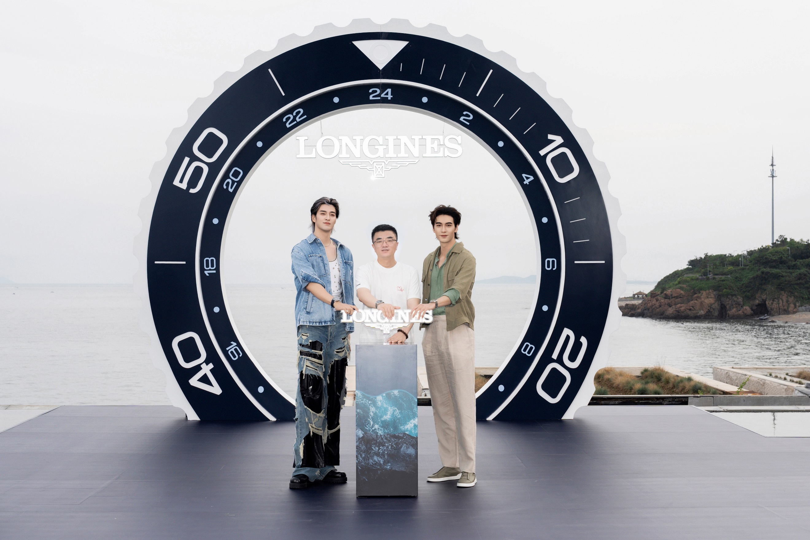 浪琴表中国区副总裁解琦先生,携手演员陈星旭与音乐制作人、歌手James李铢衔共同揭幕全新康卡斯潜水系列GMT腕表。(从左至右:音乐制作人和歌手James李铢衔,浪琴表中国区副总裁解琦先生,演员陈星旭)