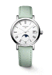 浪琴表博雅系列以简洁设计与经典优雅风格而著称。这款直径30毫米的腕表是博雅系列中首批搭载月相功能的表款之一。哑光白表盘饰有漆绘罗马数字时标,3时位置设有日期窗口,6时位置设有蓝天背景月相窗口。精钢表壳内搭载L296高精度石英机芯,配有薄荷绿皮革表带和精钢针扣。
