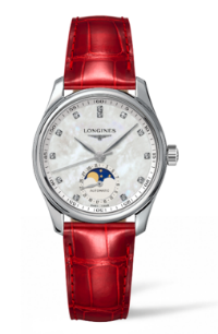 浪琴表名匠系列月相腕表,直径34毫米的精钢表壳内,搭载L899自动上链机械机芯。6点钟位置设有月相显示,以及环状日期显示。白色珍珠母贝表盘上饰以钻石时标,搭配优雅的红色鳄鱼皮表带。