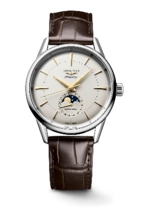 军旗复刻系列月相腕表推出配备月相功能的全新款式。月相显示窗口位于表盘6时位置,配有日期指示指针。搭载专属机芯,内置硅游丝,具有防磁性能。旋入式精钢表壳直径38.5毫米,表面经过缎面拉丝处理,表耳缩短呈倒角设计。该款腕表的乳白色表盘呈弧面造型,配有11个镶嵌时标与镀金指针。棕色皮革表带,搭配全新的复古针扣。