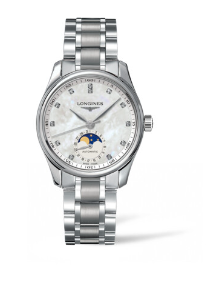 浪琴表名匠系列月相腕表,表款直径34毫米,搭载L899专属自动上链机械机芯。6点钟位置设有月相显示,以及环状日期显示,小指针指示当前所处日期。白色珍珠母贝表盘上饰以钻石时标,搭配精钢表链。